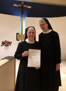 Während der Vesper feierten wir mit einer Lichtfeier am Sonntag, 08. Februar 2026 die Einsetzung unserer Oberin Sr. Hildegard Jansing. Sr. Rachel Feller, Priorin, würdigte nach der Lesung das Wirken von Sr. Hildegard Jansing während ihrer ersten Amtszeit und überreichte ihr für die zweite Amtszeit die Einsetzungsurkunde.